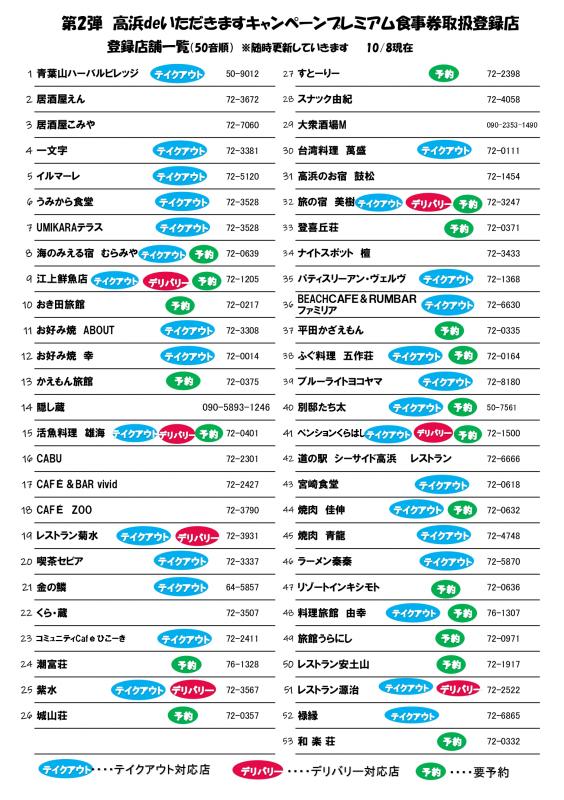 高浜deいただきますキャンペーン!プレミアム食事券取扱登録店について 2021.12.09 プレミアム食事券取扱登録店は販売後も随時申込を受付しております。 登録店の追加がありましたら随時一覧の更新をしますのでご確認ください。 プレミアム食事券取扱登録店(12/9現在)